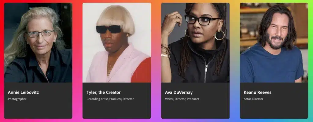Tanto a palestra principal quanto as sessões de breakout estarão disponíveis para todos os inscritos. Entre os participantes estão a cineasta vencedora do Oscar Ava DuVernay, o ator e diretor Keanu Reeves, a renomada fotógrafa Annie Leibovitz e o artista Tyler, the Creator. Espere o inesperado durante as sessões de palestra ao vivo com os especialistas. E o melhor ainda está por vir … fique ligado no próximo mês para a lista completa de palestrantes de 2020.