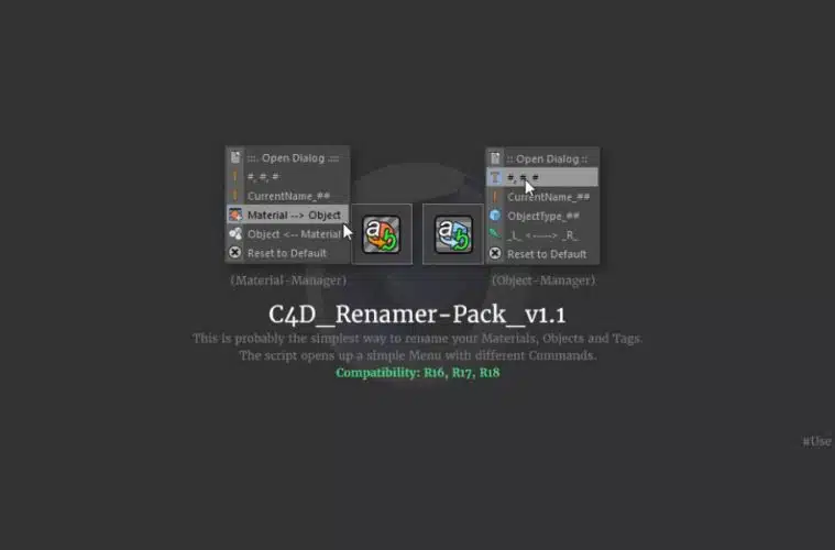 Agora na versão 1.1, o C4D Renamer Pack trás uma caixa de diálogo contendo todas as opções necessárias para as ações. Com isso, pode-se facilmente renomear objetos em situações específicas. O script também possui um menu acessível para tarefas remanescentes.