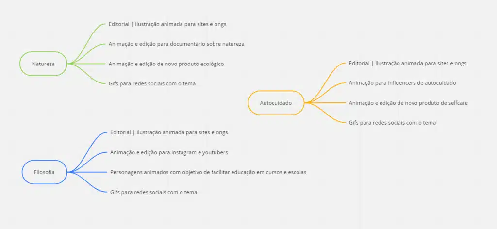 Com a lista pronta, tente imaginar quais mercados ou projetos que poderiam surgir dentro desses temas. Esse exercício aumenta nossa percepção sobre a oferta e demanda, nos faz imaginar possíveis briefings que podem surgir ou até problemas reais que poderiam ser solucionados com o uso de animação. Peguei 3 temas acima e criei um mapa mental sobre eles como exemplo: