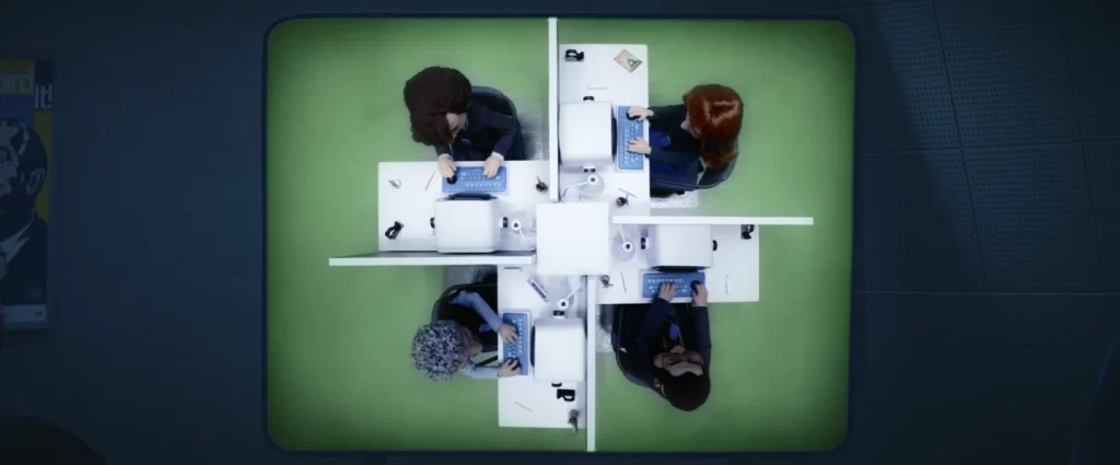 Ruptura em sua segunda temporada, tem uma cena em particular nos chamou a atenção. Logo após o golpe, eles levam a equipe de refinamento da Macrodata para uma sala onde o RH mostra um vídeo, um filme em stop motion com Mark, Helly e sua turma como fantoches.