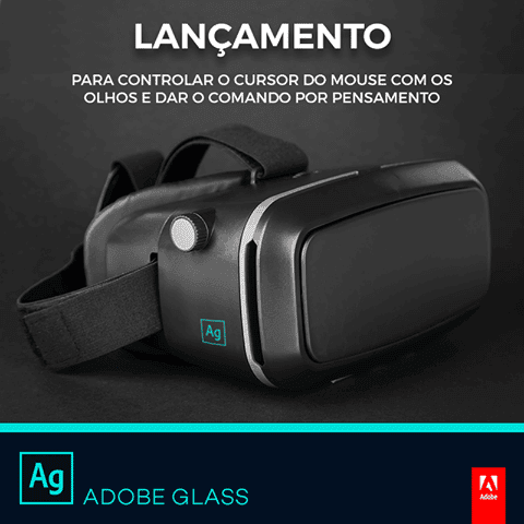 Anunciamos hoje o lançamento do Adobe Glass, óculos inteligente que se conecta ao córtex motor do cérebro e é capaz de mover o mouse na tela e executar até os tutoriais mais complexos de todos os nossos aplicativos com mínimo esforço”. Adobe Brasil – via Facebook