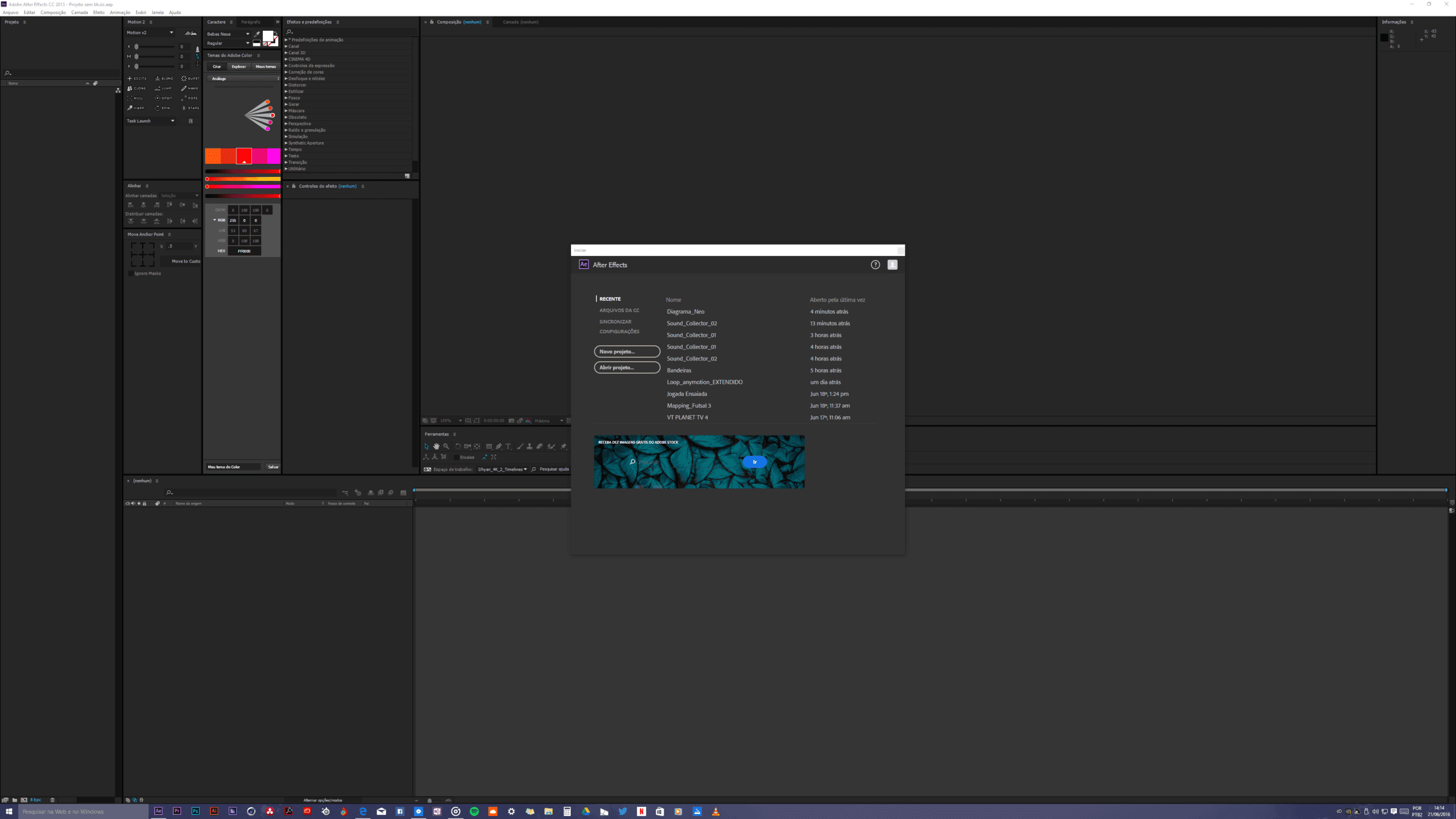 Outra sacada são as novas telas de boas vindas. Ela não só carrega mais rápido, como mostra há quanto tempo abriu os projetos recentes, tendo ainda opções de acesso aos Arquivos CC, Sincronia CC, Configurações, Novo Projeto e Abrir Projeto.