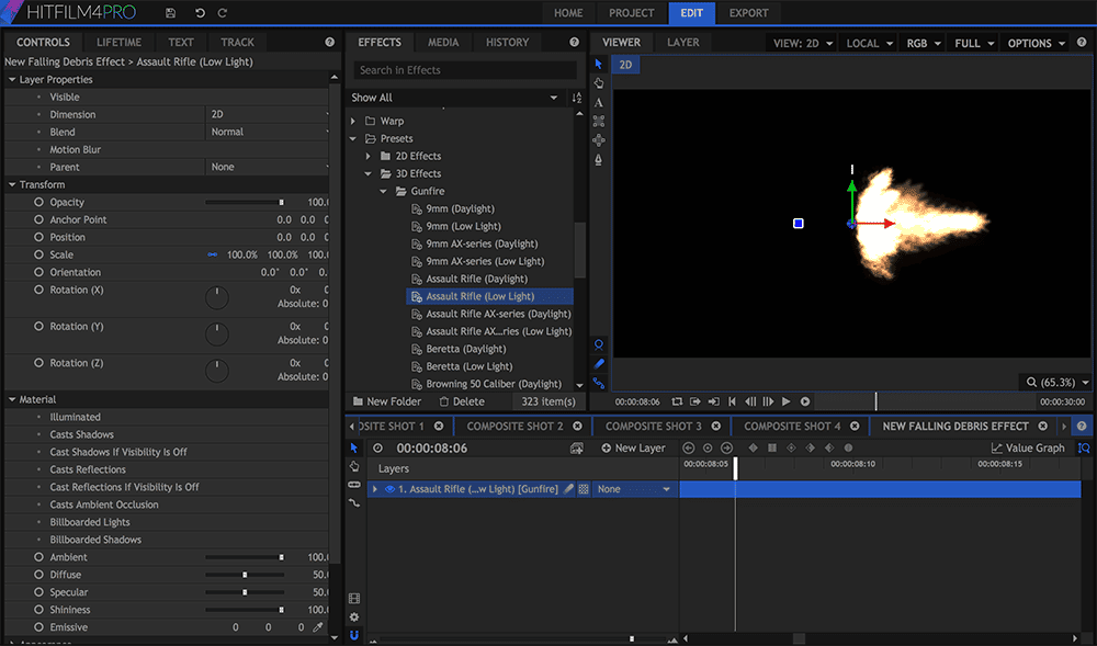HitFilm 4 Pro é um software de composição antes de tudo. Os desenvolvedores claramente gastaram muito tempo aperfeiçoando os efeitos individuais. É um ótimo software para adicionar efeitos para seu projeto. Na verdade, um monte de efeitos e presets encontrados no HitFilm não podem ser encontrados no After Effects por padrão (fogo, fumaça, neve, etc.).