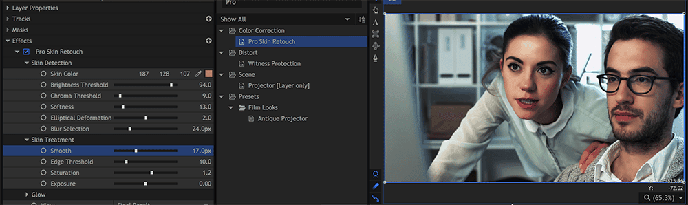 Pro Skin Retouch: Se você está trabalhando em um clipe de moda ou comercial, essa ferramenta do HitFilm é realmente um grande recurso. Pode-se facilmente selecionar a pele e suavizá-la.Também pode-se ajustar a saturação, a exposição, e brilho neste efeito. Há até uma opção para converter sua seleção em uma máscara preto-e-branco.