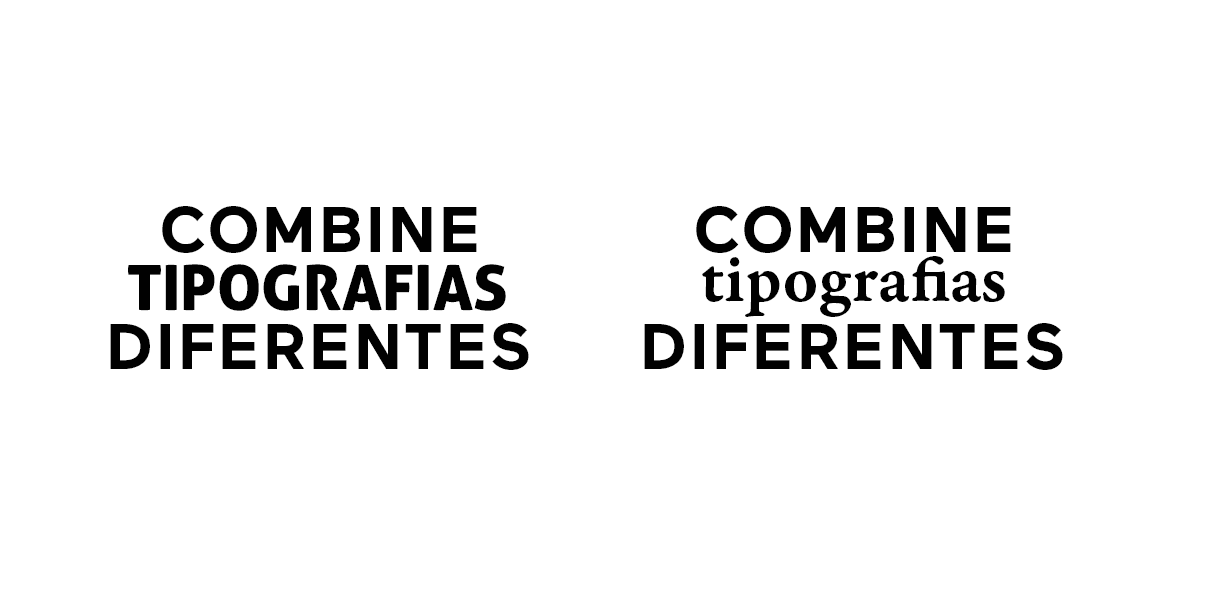 A regra mais importante é que as fontes devem sempre ser bem diferentes entre si. Duas fontes muito parecidas vão “brigar” e disputar a atenção do expectador.