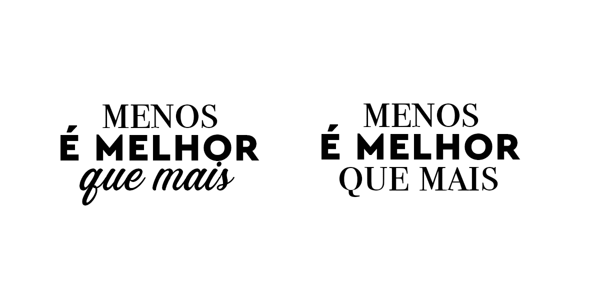 A primeira composição usa duas fontes sem serifa. Elas são parecidas demais para gerarem contraste. Já na segunda composição temos uma tipografia mais moderna sem serifa, e a outra mais clássica serifada, criando uma combinação muito mais agradável visualmente.