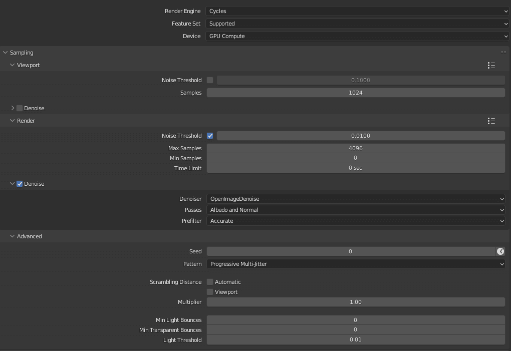 Esse aumento de desempenho é acompanhado por um redesenho da interface do usuário de sampling e das configurações padrão, para refletir a sampling adaptativa aprimorada e ocupar o centro do palco como a forma preferida de usar os ciclos. Agora existem predefinições separadas para viewport e render sampling, e uma nova opção de limite de renderização baseada em tempo foi adicionada.