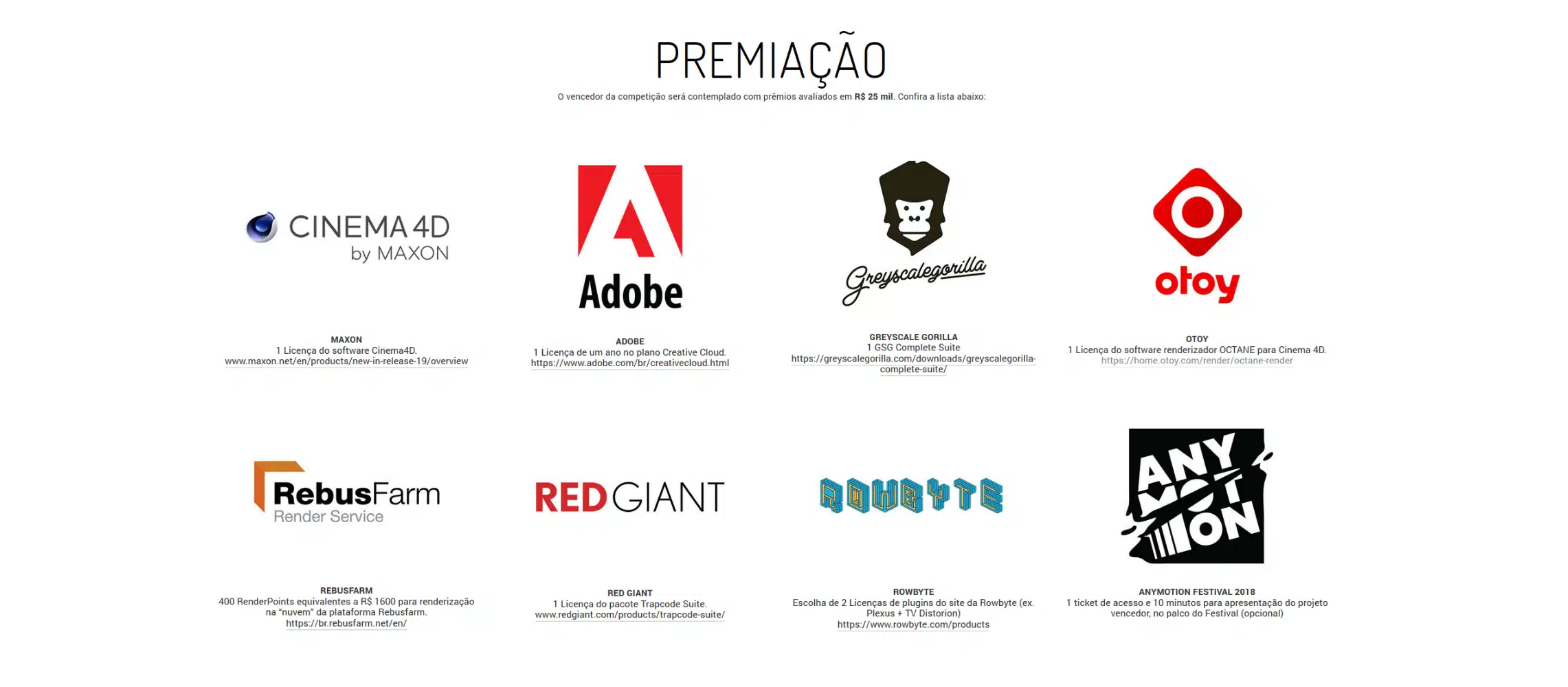 A premiação do evento é mais do que bem-vinda, somando ao todo R$25 mil Reais em prêmios! Eles vão desde licenças do Cinema 4D até tickets para o Anymotion 2018 (evento principal).