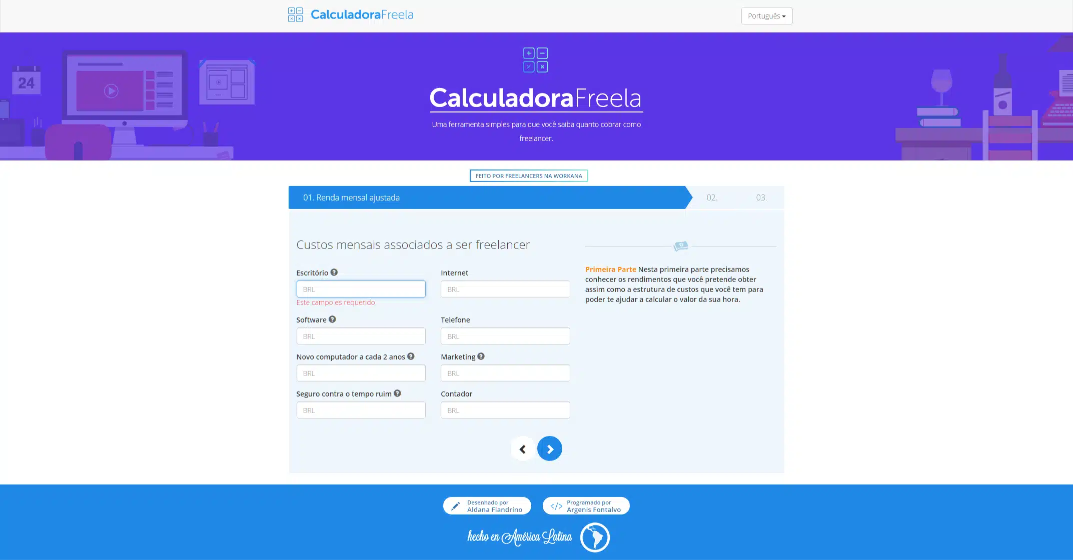 A CalculadoraFreela faz os cálculos baseados no princípio mais básico de todos: o quanto se quer ganhar mensalmente. Assim, esse é o primeiro campo a ser preenchido e em seguida temos os custos mensais relativos à sua existência (aluguel, software, novo Pc a cada 2 anos, seguro, telefone, contador, etc).
