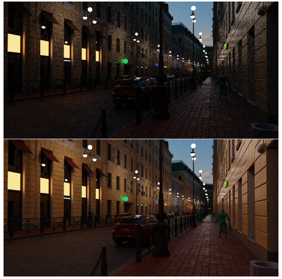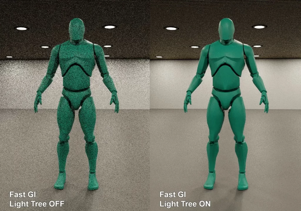 O Cycles agora oferece suporte ao Light Trees para amostras de cenas com várias luzes de maneira mais eficaz, reduzindo significativamente o ruído. A amostragem de Light Trees pode ser ativada/desativada no painel Sampling > Lights.