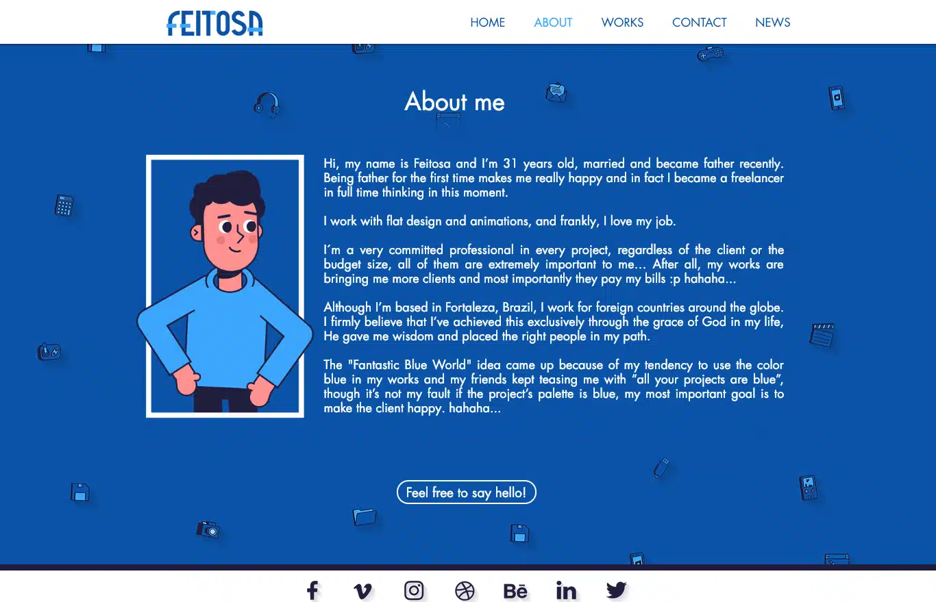 Seu site deve ter uma página que fala um pouco sobre você, suas aspirações e, principalmente, deve mostrar um pouco sobre sua personalidade. Uma foto ou ilustração sua é muito bem-vinda. Veja um exemplo legal no site do Feitosa, um animador de personagem de Fortaleza – CE.
