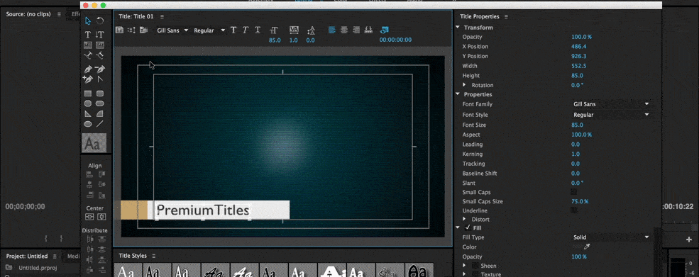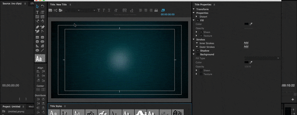 Primeiramente você precisa criar o design do seu title. Pra isso, crie um novo title indo em File > New > Title (ou simplesmente seja esperto e use Ctrl+T ou Cmmd+T em Macs). Nomeie o title e dê ok. Uma vez que o painel de edição de titles surgir, crie um title template da maneira que bem entender e que atenda suas exigências. Lembre-se de que você está criando um template, então há sempre a opção de criar algo mais neutro para que possa usar em múltiplos projetos.